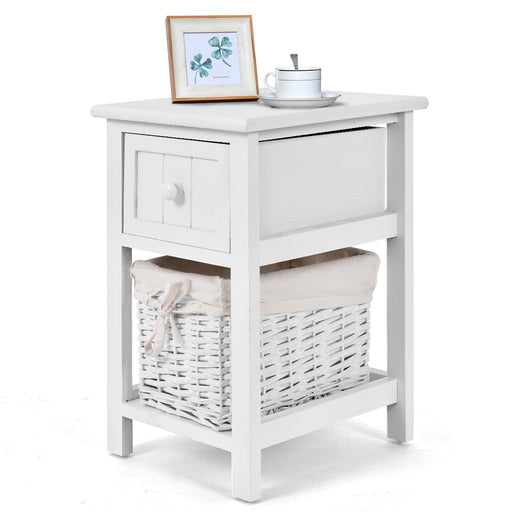 View full details2-Tier White Wood Nightstand - Comes with 1 Drawer and 1 Basket - Perfect Storage Solution for Your Home