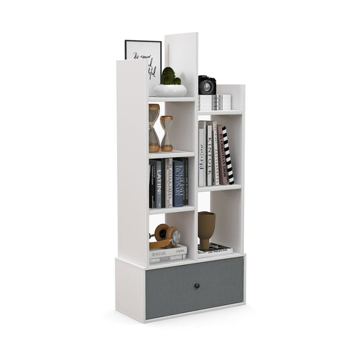 View full detailsModern Multi-Shelf Bookcase with Drawer - Freestanding 6-Tier Storage, Wooden Legs, Stylish White & Grey Finish - Ideal for Home Office and Display Décor