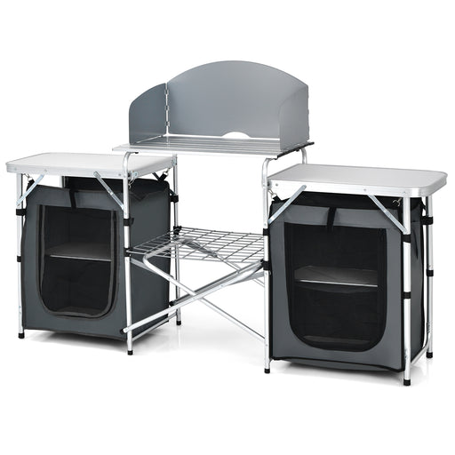 View full detailsPortable Aluminum Camping Kitchen Station - Foldable Table with 3 Fabric Storage Cupboards, Windshield, Light Holder - Ideal for BBQ, RV Trips, and Outdoor Picnics