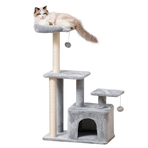 View full detailsCat Tree Playground with Sisal Scratching Post - Multi-Level Tower with Rotatable Bar, Tunnel & Dangling Toys for Kittens - Compact Grey Cat Condo for Play & Rest