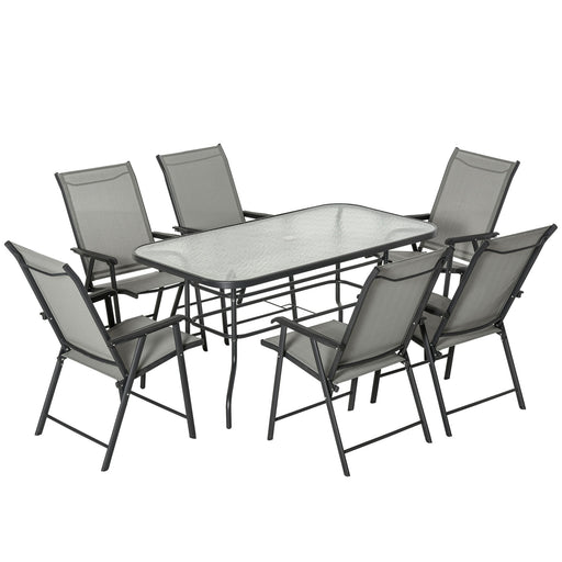 View full details7-Piece Garden Patio Dining Set - Steel Frame, Foldable Chairs, Glass Tabletop, Texteline Seating with Black & Grey Cushions - Ideal for Outdoor Entertaining and Relaxation