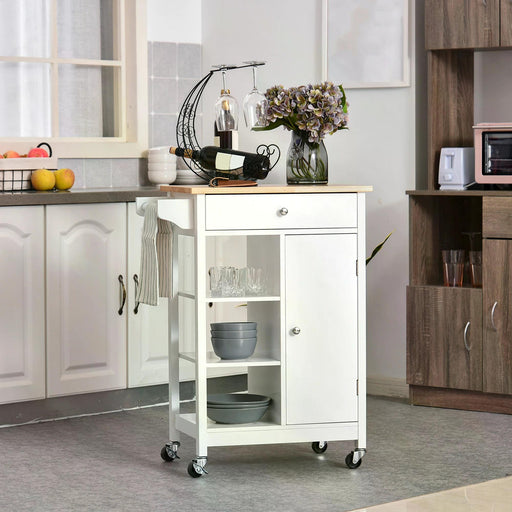 View full detailsKitchen Storage Trolley with Wooden Top - 3-Tier Shelving, Cupboard, Drawer, and Towel Rail on 4 Casters - Space-Saving, Mobile Organizer for Home Chefs
