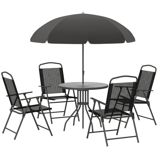 View full details6-Piece Outdoor Bistro Set - Texteline Folding Chairs, Table, and Umbrella in Black - Ideal Patio Furniture for Garden and Dining