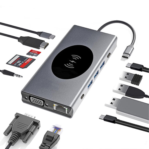 View full detailsPobod 13-in-1 Type-C Docking Station - USB3.0, USB-C PD, HDMI, VGA, RJ45, SD/Micro SD Card Reader, 3.5mm Audio, Wireless Phone Charger - Ideal for Phones, TVs, Tablets, and Laptops