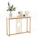 This elegant side table features a faux marble top and gold metal legs. Thanks to its extra-wide top, it offers plenty of space for your belongings, whether it's bags, keys, vases or picture frames. The table features a sturdy metal frame and smooth, water-resistant MDF top to ensure durability and easy maintenance. The anti-toppling devices and adjustable foot pads add stability and security to the console. This storage table is versatile; it can be used as an entryway table, a sideboard, or a display table. You can even put it behind a sofa to provide an additional storage option. Elegant Faux Marble Tabletop: This console table is stylish and comes with a faux marble tabletop. The elegant color of the table top is complemented by the golden metal legs. There is no doubt that this side table, which is both functional and aesthetically pleasing, will bring premium style to an interior space. Extra Storage Space: This side table has an 120 cm wide tabletop that provides you with additional space. You can put the bags or keys you need when you go out on it. The space at the bottom can be used to place an umbrella bucket or other storage boxes. Quality Material and Stable Structure: This elegant entryway table has a heavy-duty metal frame in order to be structurally strong and long-lasting. And the table top is made of high quality MDF, which is smooth and waterproof, thus making you can easily keep its shine with a towel. User-friendly Details: This accent table is equipped with anti-toppling devices. They help you secure the table to the wall, which is very important for families with children or pets. In addition, the adjustable feet make our storage table balance even on uneven floors. Easy to Assemble & Versatile Side Table: The dimensions are: 120 x 29 x 81 cm. Following the detailed instructions, you can assemble this side table in a very short time. You can use it as an entryway table, sideboard or display table. It can also be placed behind the sofa for additional storage options.