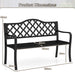 Enhance your outdoor living space with this exquisitely designed metal garden bench, combining lasting durability with stylish comfort. Built to withstand long-time outdoor use, this patio bench features a robust metal frame with a protective coating, ensuring longevity and stability. Comfortably seating 2-3 people, the metal bench features a 300kg capacity and a 120cm seat length, ideal for enjoying relaxation with friends or family. The contoured seat and curved armrests ensure premium comfort, while the appealing patterns make the bench more eye-catching. Perfect for garden, patio, or poolside, this loveseat bench with thoughtful details offers both functionality and elegance. Strong Metal Construction: This garden bench is supported by robust metal frame with well-coated surface for extended outdoor use. The anti-deformation structure with anti-slip foot pads also provides enhanced stability. Spacious Seating Capacity: Perfect for small gatherings, this bench comfortably seats up to 2-3 people with 300kg max load and 120cm seat length, ideal for shared leisure moments. Comfort-Engineered Design: Experience optimal comfort with the patio bench that includes a contoured seat and curved armrests, promoting a premium sitting posture and providing relaxation for extended periods. Attractive Backrest: This metal bench not only serves a practical purpose but also adds a decorative touch with the intricately patterned backrest, making it a visually appealing piece for outdoor space. Versatile Outdoor Use: Ideal for numerous outdoor locations such as gardens, patios, or by the pool, this patio bench blends beauty and functionality, enhancing any outdoor setting with ease and style.