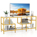 Colour: Gold Material: Metal, Tempered Glass Overall Dimensions: 147 x 40 x 62 cm (L x W x H) Height off the Ground: 9 cm Load Capacity of Countertop: 50 kg Load Capacity of Each Middle Large Shelf: 10 kg Load Capacity of Middel Small Shelf: 5 kg Load Capacity of Bottom Shelf: 25 kg Net Weight: 26 kg Package Includes: 1 x TV Stand 1 x Instruction Manual