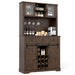 Perfect for any furnishing enthusiast, this buffet cabinet brings a warm, inviting feel to your home with its elegant wood finish and vintage barn doors. Not just a pretty face, it offers a plethora of custom storage solutions, including a glass-door top hutch, 4 adjustable shelves, 3 storage drawers, and clever cord management. Wine aficionados will rejoice over the built-in stemware holders and chic wine rack. Plus, at 184cm tall and equipped with an added safety feature, it ensures both style and stability. Bring this all-in-one cabinet to your home and revitalize your home aesthetics! If you are looking for such a product, do not hesitate to buy it! Farmhouse Aesthetics: This coffee bar cabinet features a rustic wood grain finish, 2 sliding barn doors, and metal corner protectors, giving it an elegant and retro appeal. Its farmhouse-inspired design adds warmth and character to any kitchen or dining area. Versatile Storage Options: The kitchen pantry cabinet includes a top hutch with 2 glass door cabinets, 2 open shelves, and each shelf behind the glass door has 6 adjustable positions. It also features a sideboard buffet cabinet with a microwave countertop and 3 drawers, along with two 3-position adjustable shelves for customizable storage space. Wine Storage & Display: Equipped with 4-row of stemware holder and a 9-bottle wine rack, this kitchen cupboard offers both functional storage and stylish display options. It’s perfect for wine enthusiasts who want to keep their collection organized and visible. Stable & Robust Construction: Standing at 184cm tall on a sturdy base, this wine cabinet ensures stability and durability. The included anti-tipping kit provides an added layer of safety, preventing falling accidents and ensuring long-term use. Thoughtfully Designed Details: Designed with transparent tempered glass doors, this farmhouse storage cabinet allows for a clear display of your items while ensuring long-term durability. It also features a built-in cable hole to avoid messy wires, along with premium metal slides, smooth hinges, and magnetic door catches for easy and smooth operation.