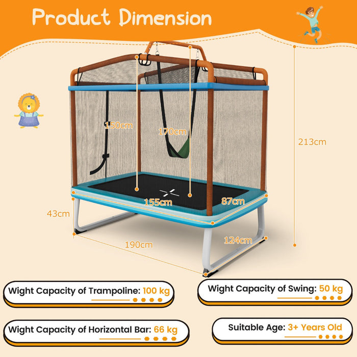 Transform the outdoor play into unforgettable experiences for your kids with this amazing 3-in-1 trampoline. Equipped with unique features and multi-play components, it promises tons of fun and exciting adventures for your little ones. Complete with a detachable swing and horizontal bar, it provides your kids with endless play opportunities – from jumping and swinging to hanging. The trampoline's design is perfect for smaller backyards, thanks to its convenient rectangular shape.