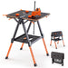 This adjustable table effortlessly converts from a workbench to a reliable sawhorse in a snap, ensuring you are always prepared for the task at hand. Boasting 8 levels of height adjustment, you can tailor your workspace to a perfect fit. The addition of convenient joiners means you can lock multiple units together, expanding your surface area to meet any challenge. Durability is not compromised for versatility. This work table is solidly constructed, boasting a robust metal framework and a thick MDF tabletop capable of supporting up to 450 kg. Your clamping needs are met with innovation: featuring 2 quick-slip clamps and 4 clamp dogs, securing materials of various shapes and sizes is no longer a hurdle. Optimize your workspace with this foldable, adjustable, and remarkably durable 2-in-1 work table. Instant to Fold: With 2-piece folding tabletop, the work table can be quickly switched between workbench and sawhorse. And the convenient folding design is also designed for space-saving storage and effortless carrying. Free to Adjust: This functional 2-in-1 work table features 8-level height adjustment from 60 to 91 cm, which will perfectly satisfy your different working requirements whether sitting or standing. And the push buttons are for simple adjustment. More Flexible with Two: By placing appropriate timbers on the 2 x 4 support arms, you can transform 2 sawhorses in to a jobsite table. Also, the 2 joiners are included, so multiple units can be locked together side by side for larger work space. Sturdy Metal Support: The heavy-duty metal structure with thick MDF tabletop ensures 450 kg max load, enabling the work table to support all kinds of tools and material, which is ideal for heavy-duty work tasks. Efficient to Clamp: Equipped with 2 quick-slip clamps and 4 clamp dogs, the work table will secure all materials whether horizontally, vertically or irregularly. The built-in measuring guides and the bottom shelf will offer you more convenience.