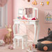 This unique vanity set with a pink pattern will be your ideal choice! Tri-folding mirror lets your princess admire her beauty from any angle. There is also a centre drawer to store their favourite accessories like hair bands, nail polish, combs etc. With a detachable top, you can quickly transform it into a study desk. And your kids will love the 2 in 1 vanity set of their own size. If you are looking for a kids vanity set like this, do not hesitate to place an order! Perfect Gift for Little Girls: Featuring a colourful design plus a lovely print, this vanity table and stool set will be an ideal birthday or Christmas gift for kids. In addition, the children's desk is equipped with a practical drawer to store kids' cosmetics, jewellery, combs, dolls, etc. to keep the desktop neat and clean. Removable Tri-folding Mirror: The makeup dressing table features a tri-folding and high-definition mirror, allowing kids to see themselves clearly from all angles when sitting in front of the table. What's more, the mirror can be easily removed to use the vanity table as a writing desk. Safe and Child-friendly Design: This girl's vanity table and stool set features round corners and smooth edges to provide a secure playing environment for kids. Meanwhile, the back of the dresser comes with an anti-toppling device, allowing you to attach it to the wall firmly for added stability and safety. Selected Material and Sturdy Frame: Made of high-quality MDF with non-toxic paint, this pretend to play vanity set ensures great stability and long-lasting use. Besides, the thickened and curved legs provide strong support and the bottom non-slip foot pads are designed to protect the floor from scratches. Easy Assembly and Maintain: Equipped with all the necessary accessories and detailed instructions, this kids vanity and stool set is easy to put together in a short time. When it comes to daily maintenance, the smooth surface is easy to clean with a damp cloth.