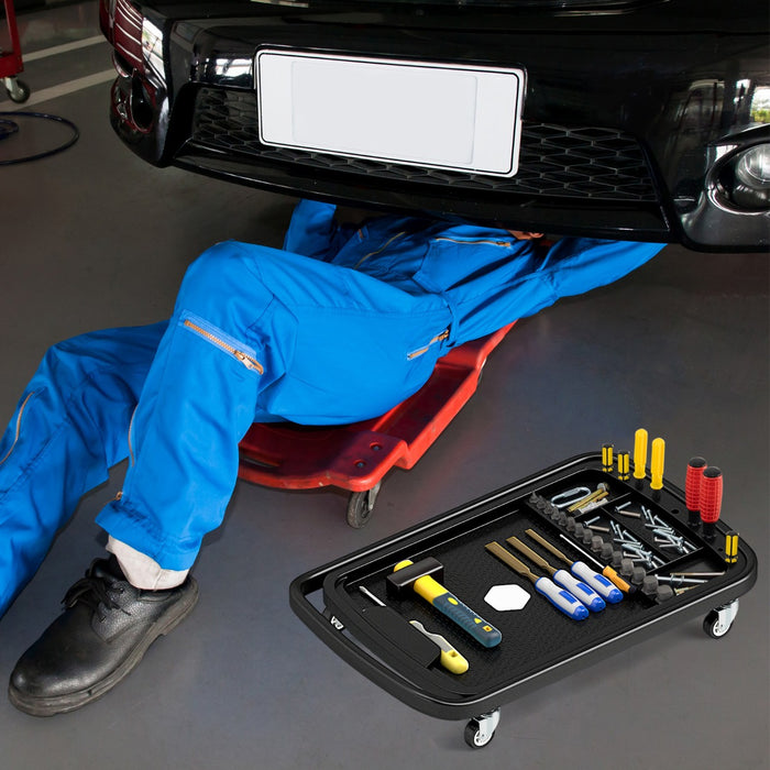 This versatile 2-in-1 rolling tool tray is the ideal addition for any mechanic's workspace, providing ultimate convenience and organizational flexibility. The height of the tool tray can be adjusted from 31.5" to 48.5" to suit varied tasks, while the detachable tray with safety lock ensures tools are always within reach. The work table features a classified storage area with multiple holders and trays, designed expertly to keep your workspace tidy and efficient. Equipped with 8 smooth, rolling casters, 4 on the tray and 4 on the cart, the work table offers exceptional mobility and versatile application. Made of premium metal which is deformation resistant, this heavy-duty rolling work table is perfect not only for garages but also auto shops, tool rooms, and even salons. Make every task simpler and more efficient with this robust mechanic tool cart. Bullet Point: Flexible Height Adjustment: The height of the tool tray can be easily adjusted from lowest 31.5" to highest 48.5", perfect for mechanics who need a customizable workspace. For adjustment, you just need to open the trigger to the left, loosen the screw at the same time, press the button and then pull up or down. Detachable Tool Tray: Experience the convenience of a removable tray with a safety lock, allowing you to bring tools closer to work area. The convenient handle makes the tool tray effortless for you to carry anywhere. Classified Storage Area: Keep your tools neatly organized with a classified storage area that provides ample space to sort different types of tools. The tool panel includes a big tool area, 15 socket holders, 2 magnet parts trays, 2 spanner trays and 9 screwdriver holders. 8 Functional Rolling Casters: Featuring 4 3" casters at the bottom, 2 with brakes, this tool cart offers superior mobility. Moreover, the tool tray itself also includes 4 2" casters for easy movement during independent use. Versatile Sturdy Work Table: With 130 lbs max load, this work table featuring H-shaped base can handle heavy-duty projects. The versatility and sturdiness make it suitable not only for garage but also for auto shop, tool room or even salon.