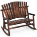 Expertly crafted from solid fir and pine woods treated with high-temp carbonization, this Adirondack rocker ensures long-lasting durability. Its ergonomic design features a high backrest and a contoured seat with the slatted surface, meticulously shaped for optimal breathability and comfort. Moreover, the smooth rocking motion offers a serene escape, perfect for unwinding with your loved one in the tranquility of your garden, porch, or patio. Additionally, the sturdy construction, bolstered by a reinforced crossbar, safely supports up to 300kg, ensuring both reliability and safety in your serene outdoor retreat. Long-Lasting Durability: Constructed from solid fir wood and pine wood with high-temperature carbonization, this outdoor rocking chair maintains its beauty through seasons. For optimal maintenance, please apply oil to the wooden surface after 12 months of use.Smooth Rocking, Serene Relaxing: Engineered to provide a gentle and soothing rocking motion, this porch rocker ensures ultimate relaxation. The perfectly balanced rockers are designed to offer a smooth, fluid motion that helps you unwind and relax completely.Ergonomic Design with Breathability: This double rocking chair features a high backrest and a contoured seat with a slatted design. This ergonomic construction provides optimal support for you and your loved one while ensuring breathability, so you stay cool and comfortable even on summer days.Safety and Stability You Can Trust: With a sturdy construction that includes a reinforced crossbar, this garden bench supports weights of up to 300kg effortlessly. Each component is designed to contribute to an overall structure that promises both reliability and safety, letting you relax with peace of mind.Rustic Charm, Versatile Use: Exuding a rustic log-built Adirondack charm, this patio rocking chair is a stylish addition to different exterior settings. Its natural aesthetic complements various decorations and is perfect for your porch, balcony, garden, or backyard, offering a cohesive look that’s both attractive and practical.