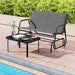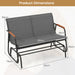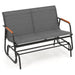 The wide bench features a smooth gliding motion that effortlessly eases stress, while the robust gliding arms ensure both stability and safety. Ergonomically designed with contoured seats and backs, and smooth teak wood armrests, the rocking seat adds more comfort and elegance. The breathable, rip-resistant fabric is quick-drying, making the gliding bench perfect for long-lasting outdoor use. Supported by a sturdy metal frame with adjustable foot pads, the glider maintains firm ground placement. All in all, this glider bench invites you to enjoy serene moments on your porch, backyard, or poolside. Smooth and Gentle Gliding: With smooth forward and backward gliding motion, the gliding bench will relieve your fatigue and stress. The robust gliding arms at the bottom ensure stability and safety. High-Level Comfort: Designed with comfort in mind, the rocking bench features ergonomic seat and backrest. The curved teak wood armrests not only feature natural beauty and high hardness, but also provide a smooth and cozy touch. High-Quality Seat Fabric: Crafted from breathable, rip-resistant fabric, the seat of the gliding chair is also quick-drying. Such design makes the bench both comfortable and withstand extended outdoor use. Seats up to 2: Featuring 108 cm seat length, this gliding loveseat with 300 kg max load can accommodate up to 2 people. Therefore, you can spend leisure time with family or friend. Wide Applications: Versatile and stylish, this wide gliding chair is perfect for any outdoor setting such as porch, backyard, or poolside. Note: Please avoid rain exposure for prolonged service life.