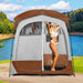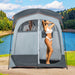 Colour: Grey/Coffee/Blue Material: Metal, fiberglass pole, 190T silver-coated polyester, PE fabric Overall dimension: 210 x 107 x 210cm (L x W x H) Size of front mesh window: 67 x 42cm (L x H) Size of 2 back roll-Up windows: 60 x 37cm (L x H) Size of carry bag: 65 x 16 x 16cm (L x W x H) Recommended number of people: 2 Net weight: 5kg Box Qty:1(May vary by batch) Package includes: 1 x Shower tent 1 x Carry bag 4 x Fasten rope 10 x Ground stake 1 x instruction manual Installation Video