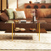 Transform your living space with our mid-century modern coffee table, where vintage charm meets modern practicality. Crafted with an exquisite amber-colored tempered glass top that resists scratches, heat, and water, this accent table ensures longevity and effortless upkeep. Flaunt your decorations and keep essentials at hand with its spacious storage shelf. Supported by a robust metal frame capable of holding up to 165 lbs and designed with sleek golden legs, it's not just a table—it's the highlight of any room! Plus, cleanup is a breeze with its thoughtful high-clearance design. Why wait? Elevate your home with this must-have centerpiece today! Bullet Point:Mid-Century Modern Charm: This coffee table is a stylish statement piece! The amber-colored glass and wood grain shelf add vintage elegance, while the golden tapered legs give it a modern touch that fits any decoration style.High-Quality Tempered Glass Top: Scratch-proof, heat-resistant, and waterproof, the accent table's tempered glass top is built to last! Easily wipe off spills and keep your table looking brand new.Ample Storage with 2-Tier Design: Display your favorite decorations on the top tier and hide clutter in the open shelf below. This 2-tier center table keeps your living room stylish and organized.Sturdy Metal Frame: Reinforced with crossbars, this rectangle coffee table with metal frame supports up to 165 lbs. It's strong enough for all your needs and stylish enough to be the centerpiece of your living room.Thoughtful Design: Protective suction cups keep the glass top securely in place, and the 8" clearance under the table makes cleaning a breeze. Every detail of the tea table is designed for both style and practicality!