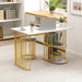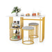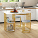 The rectangular dining table features a 2-layer open shelf that perfectly caters to your storage needs, creating a clutter-free dining space. Moreover, the 2 stools can be put under the table to save space when not in use. Additionally, the upholstered seat allows you to indulge in comfortable dining sessions with the skin-friendly flannel velvet cover and sponge filling. Built to last, the metal support frame is reinforced with vertical tubes to distribute pressure for added stability. The veneered top is not only aesthetically pleasing but also easy to maintain, requiring just a simple wipe with a cloth. More than that, the simple yet stylish structure and color coordination make the kitchen table set a timeless addition that complements any home decorative styles. Large Table with Storage: The highlight of the dining table is the 2-layer open shelves, which keep your dining essentials within easy reach, allowing you to keep your dining area organized and tidy at all times. Additionally, the 110 cm x 70 cm spacious tabletop can comfortably accommodate 2 people. Cozy Upholstered Seat: The stools will pamper you with soft and skin-friendly flannel velvet covers. Furthermore, the seats are filled with high-density sponge, which ensure you to enjoy long meals with family and friends without any discomfort. Durability Meets Stability: Unlike traditional dining table set with 4 metal support legs, these adopt added vertical tubes that distribute pressure evenly for enhanced stability, while ensuring a pleasing appearance. In addition, there exists adjustable foot pads to adapt to uneven floors. Stylish and Elegant Appearance: Featuring a faux MDF marble top, complemented by a gold metal frame and white seats, the 3 piece kitchen table set adds a touch of elegance to your dining area. Therefore, it will be the centerpiece for any settings, such as living rooms, apartments, restaurants. Space-saving Dining Furniture: The dining table measures 110 cm x 70 cm x 75 cm (L x W x H) and each stool measures 36 cm x 36 cm x 48 cm (L x W x H), making the modern dinette table set an ideal fit for various small spaces. Additionally, the stools can be neatly tucked under the table when not in use.