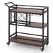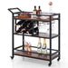 Introducing our sophisticated rolling bar cart, designed to impress and serve with style. This versatile wine cart is the ultimate solution for organizing your beverage essentials, whether it's for a night of entertaining guests or a quiet evening at home. With a sleek profile and a blend of warm rustic accents, it's not just furniture but a statement piece for any modern home.