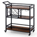 The cart's black metal frame combined with the warm tones of the wood grain evokes an elegant, industrial aesthetic. This piece brings a sophisticated yet cozy vibe to any space, complemented by the subtle gleam of your glassware and the rich hues of your selected wines.
