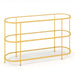 Colour: Gold Material: Metal, Tempered Glass Overall Dimensions: 140 x 41 x 82 cm (L x W x H) Size of Each Shelf: 136 x 37 cm (L x W) Height of Clearance: 34 cm Height off the Ground: 9 cm Load Capacity of Tabletop: 75 kg Load Capacity of Each Shelf: 30 kg Net Weight: 23.5 kg Package Includes: 1 x TV Stand 1 x Instruction Manual