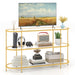 Enjoy great viewing pleasure with the chic 140cm TV stand that accommodates up to 65-inch TVs. This media console stand has a wide tabletop and 2 storage shelves, keeping your essentials organized. The sturdy metal frame ensures reliable support for your electronics and includes adjustable foot pads for stability on any surface and enhanced floor protection. Its premium tempered glass adds a modern touch and is easy to maintain, with anti-slip pads for added stability. Perfect for the living room, entryway, or study, this entertainment center seamlessly fits into any space, offering both functionality and style. Support TVs up to 65”: Ideal for both cozy movie nights and chic social gatherings, the 140cm TV stand features a wide countertop and accommodates TVs up to 65 inches. The stand perfectly elevates your viewing experience. 3-Tier Storage Solution: The TV console table includes 2 additional shelves beneath the main countertop, offering large space for audio equipment, media players, books, or potted plants. Therefore, you can organize and display your essentials with ease. Robust Metal Structure: Thanks to reliable metal support, the entertainment center offers an enduring solution to support your electronics with confidence. Enhanced with adjustable foot pads, this stand ensures level placement even on uneven floors. Premium Tempered Glass: Featuring impact-proof tempered glass, the console stand not only adds a touch of modern sophistication but is also incredibly easy to maintain. Each tier comes with anti-slip pads for the glass to ensure optimal stability. Versatile Functionality: The TV stand fits seamlessly into any room. Whether you want to display your new TV in the living room, add a welcoming touch in the entryway, or need an elegant display stand, the stand will be a perfect choice.