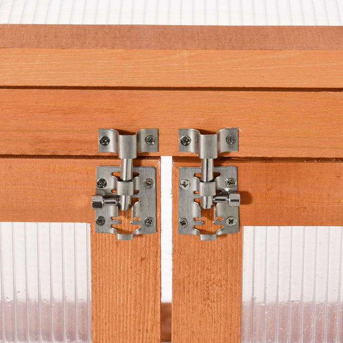 Our wooden greenhouse features resilient polycarbonate panels that not only protect your greenery from harmful ultraviolet rays with their UV-proof design but also provide a warm nurturing environment with their excellent light transmission. The sturdy fir wood frame, coupled with rust-resistant galvanized metal components, ensures that your greenhouse stands firmly against the test of time and weather, safeguarding your plantings through the seasons.