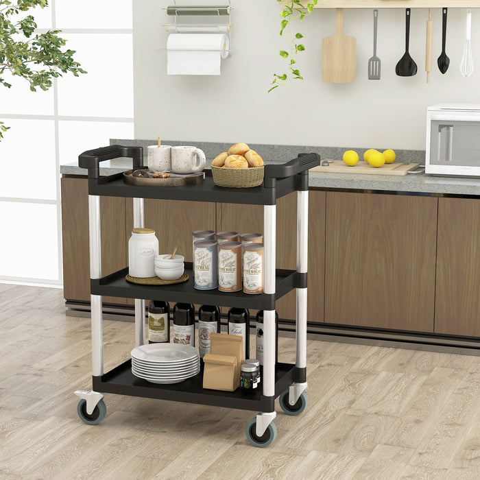 Color: Black, Silver Material: PP, Aluminum Overall Dimension: 80 x 41 x 97 cm (L x W x H) Dimension of Each Tier: 62 x 41 cm (L x W) Diameter of Each Wheel: 10 cm Weight Capacity of Each Tier: 50 kg Net Weight: 9 kg Package Includes: 1 x Utility Cart 1 x Instruction