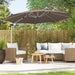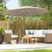 Our outdoor patio umbrella measures 325 x 261 cm (Dia. x H), providing an expansive shade area for various outdoor activities, whether it's a bustling commercial area or a cozy backyard retreat. With the ability to rotate a full 360° effortlessly and adjust the tilt angles in 5 positions, you can enjoy the optimal shade throughout the day. Other than that, the canopy is crafted from 100% new yarn-dyed polyester fabric, which is UPF50+ sun-protective and 3-year fade-resistant, ensuring long-term outdoor use. To enhance its wind resistance, the offset umbrella boasts a thick aluminum pole and 8 heavy-duty ribs, which is built to withstand the elements. And thanks to the convenient crank handle, you can effortlessly open or close your umbrella. Note: We recommend a weighted base (not included) to fix the umbrella for enhancing wind resistance. Spacious Coverage: This round outdoor patio umbrella features an impressive 325 cm diameter, providing a large shading area for various commercial and residential settings, such as poolsides, yards, gardens, coffee shops, and more. It includes a robust crossed base and we recommended a weighted base (not included) to fix the umbrella for enhancing wind resistance. 360° Rotation and Adjustable Tilt: This cantilever umbrella is equipped with a convenient foot pedal, allowing for seamless 360° rotation. And there are 5 adjustable tilt angles, which is easy to adjust by moving the crank handle up and down. It could provide you with optimal shade throughout the day. Premium Quality Fabric: The offset umbrella canopy is crafted of premium 250 GSM yarn-dyed polyester fabric, guaranteeing superior UPF50+ sun protection and wear resistance for long-term outdoor use. Moreover, it could resist fading for up to 3 years, maintaining its vibrant hues. Sturdy & Stable Construction: Being supported by a thick aluminum umbrella pole and 8 heavy-duty ribs, this umbrella provides robust support. And the metal frame surface is coated with rustproof paint, ensuring long-term outdoor use. Moreover, the top features reinforced triangular structure for helping stabilize the umbrella during windy conditions. Effortless Operation: This round cantilever umbrella adopts a hassle-free crank handle, making it easy to open and close the umbrella by rotating it. And there is a convenient loop strap to secure the umbrella into a compact size when not in use. Note: We recommend folding and covering it to prolong its lifespan in nighttime or under extreme weather conditions.