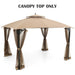 Colour: Beige/ Brown Material: Polyester Overall Size: 368 x 303 cm (L x W) Size of Top Tier: 90 x 76 cm (L x W) Net Weight: 2 kg Package Includes: 1 x Gazebo Replacement Top 1 x Instruction Box Qty: 1(May vary by batch)