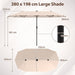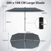 The 380 x 198 cm double-sided patio umbrella provides an extra large shading coverage, ideal for a variety of settings, from a lively backyard barbecue to tranquil poolside lounging. Not only offering unparalleled shade, it could also create a charming ambiance for your evenings with the built-in LED lights, which are powered by a solar panel, providing warm and inviting illumination for 6-8 hours. Crafted with a premium polyester canopy and supported by 5+2+5 sturdy metal umbrella ribs, the umbrella offers not only effective sun protection but also reliable use season after season. Furthermore, it features a convenient 2-section design and a hassle-free crank handle, allowing for effortless assembly and storage. Whether day or night, our solar-light patio umbrella is designed to create the perfect outdoor sanctuary where you can relax, entertain, and enjoy the outdoor moments of life. Note: we recommend turning off the power during the day to for better charging. Extra-Large Coverage: This double-sided patio umbrella measures 380 x 198 cm (L x W x H), offering a spacious shade area for your outdoor gatherings. It is ideal for patio dining settings, poolside relaxation, backyard events, and more. Solar Powered LED Lights: The umbrella ribs are equipped with 108 warm-yellow light beads, which are designed to brighten and enhance the romantic feel of your yard. The lights are powered by a top solar panel, which could last for 6-8 hours after a full charge, saving energy. Note: It includes a handy switch, and we recommend turning off the power during the day for better charging. Premium Material: The canopy is crafted of premium 180 GSM polyester fabric, which is sun-protective, water-repellent, and tear-resistant, designed to handle the elements. And in severe weather, please close your umbrella to prolong its life. Sturdy and Reliable Structure: The table umbrella is constructed from heavy-duty powder-coated metal tubes, reinforced with 5+2+5 sturdy umbrella ribs, offering enhanced durability and support against the elements, perfect for breezy environments. Note: Require a weighted base (not included). Easy Setup and Takedown: This market umbrella comes in 2 sections that can be effortlessly connected, requiring no tools, and there is a hassle-free crank handle, making it easy to open and close the umbrella. When not in use, it can be folded into a compact size for convenient storage.