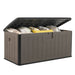 The premium deck box is crafted from weatherproof HDPE material for long-lasting use. Its large capacity is ideal for your pool supplies, pillows, tools, ensuring a clutter-free space. The openable lid with gas strut and lockable design will ensure your items are kept safe and protected. Additionally, the versatile deck box can effortlessly transform into a side table, or serve as additional seating according to your needs. Designed with cut-out handles, the storage container can be easily moved around your outdoor oasis. The simulated wood grain finish adds a touch of sophistication, enhancing the overall appeal of your outdoor setting. Whether you're hosting a gathering or simply enjoying some relaxation time outdoors, this deck box is the perfect addition. All Weather HDPE Material: Mainly crafted from HDPE material, the patio storage box boasts exceptional waterproof capabilities, ensuring that your stored items remain dry. Additionally, the selected material is anti-cracking and sun-proof, ensuring long-lasting durability. Large Storage Capacity: With dimensions of 130 x 64 x 59 cm(L x W x H), the deck box provides ample room for storing various items, from outdoor tools to household sundries. Its 380L large capacity makes it a versatile storage solution that can help you maintain a clutter-free space. Openable and Lockable Lid: Equipped with a convenient gas strut, opening and closing the lid of the storage bench is effortless and hassle-free. The lockable feature(padlock not included) adds an extra layer of security, preventing unauthorized access and safeguarding your valuables. Multipurpose Design: Featuring a simulated wood texture, the outside storage bin blends in with various settings. While perfect for home or patio storage, the versatile deck box can double as temporary seating or an outdoor coffee table, adding functionality to its sleek design. Ease of Assembly and Transportation: The deck storage box comes with built-in handles on both sides, allowing for easy lifting and movement. The slotted design makes assembling the storage container a breeze, saving you time and effort in setting it up.