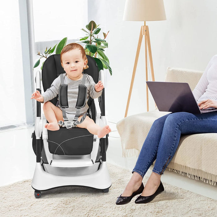 Improving convenience for you is another essential aspect of our design. The high chair boasts four lockable 360° wheels to ensure a steady stand preventing any potential harm to your baby. Moreover, these wheels allow the chair to effortlessly move around the house. From the living room to the kitchen, you can have your baby beside you at all times.