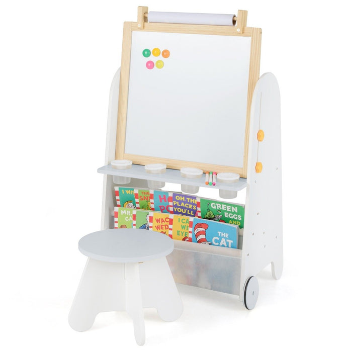 Featuring a double-sided magnetic whiteboard and blackboard, this multifunctional activity table meets various needs of children. The bookshelves and an additional storage shelf provide large storage capacity. The set also includes paint cups, chalks, an eraser, and a paper roll, making it a perfect gift for young artists. Easy to move around with rolling wheels, this set provides endless opportunities for imaginative play and skill development. 4-in-1 Multifunctional Design: This innovative setup includes a double-sided art easel—magnetic whiteboard on one side and blackboard on the other—along with a drawing paper roll and a study table. Easel dimension: 42 cm x 56 cm x 92-105 cm (L x W x H). Seat dimension: 28 cm x 25 cm (Dia x H).Adjustable Height and Easy Mobility: With a height adjustable from 92 cm to 105 cm, this standing easel can accompany the growth of your child. Equipped with rolling wheels, the easel can be moved effortlessly around your home, ensuring creative fun is never out of reach.Convenient Storage: This kids activity desk is designed with ample storage options, including paint cups, bookshelves, and a lower storage shelf, keeping all art supplies organized and within easy reach.Kid-Friendly Features: This standing art easel for kids is built with a stable A-shape structure , providing a secure platform for young artists. Moreover, smooth rounded edges avoid injuries while in use.Great Gift for Your Little One: Perfect for drawing, writing, learning, playing, and various activities, this art easel and stool set helps inspire and unleash creativity of children. The set includes a paper roll, 5 chalks, a eraser, and 4 paint cups.