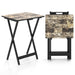 Its folding design and built-in carrying handle allow for easy transportation from room to room or even outdoors. Moreover, the included storage rack helps keep the folding tables neatly organized when not in use. The combination of rubber wood frame and X-shaped crossbar provides a sturdy and stable base. The foldable snack tables come with a chic faux marble top, combining elegance with practicality. Designed for flexibility, these tables serve multiple purposes, from a cozy sofa side table to a portable serving solution for indoor and outdoor settings. Foldable and Portable Design: Designed for convenience, these serving tray tables can be easily folded into a compact size. Additionally, the TV tray tables come with a carrying handle for easy transportation and a storage rack for neat storage. Strong Rubber Wood Frame: Made with a sturdy rubber wood frame, these TV tray tables provide high strength and long-term use. The X-shaped crossbar improves stability, ensuring the sofa side tables stay balanced. Unique Faux Marble Top: These folding tray tables feature a sleek faux marble top that elevates the aesthetic appeal. The rectangular tabletop provides a chic surface for drinks, snacks, books, or decorations. Multipurpose Table Set: This versatile table set can be used indoors or outdoors for various purposes. Whether as side tables, temporary buffets, or practical additions to your next barbecue or camping trip, they offer convenience and flexibility. Guide for Assembly: The snack tables come fully assembled and ready to use. By the way, the storage stand included requires assembly with several steps. Overall Dimensions: 48 x 40 x 67 cm (L x W x H).