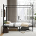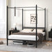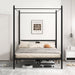 Elevate your bedroom with this metal canopy bed frame! You can hang decorative curtains and lights on the posters to create your own romantic palace. Charming slatted headboard not only enhances its visual appeal but also provides support for lounging with a book. Supported by evenly closed metal slats, the bed frame features outstanding toughness and bending resistance. Moreover, middle metal legs improve higher stability and non-slip foot pads protect your floors. Ample under-bed storage space helps maintain a clutter-free and organized bedroom. All in all, this well-designed canopy bed frame brings a touch of elegance and warmth to your living space. Bullet Point: Dreamy Canopy Bed: This canopy bed frame evokes a classic yet contemporary charm, perfect for creating a luxurious sleeping environment. 4 elegant posters are ideal for draping with curtains or lights for an added touch of romance and privacy. Heavy-duty Metal Construction: Equipped with strong metal slats, this bed supports up to 300 kg and ensures a sturdy foundation for your mattress without the need for a box spring. The noise-free foam on the metal beam boasts an undisturbed sleep. Modern Slatted Headboard: This metal platform bed comes with an integrated headboard, providing ample support for bedtime reading or relaxing. The headboard adds a stylish focal point to your bedroom setup. Under-bed Storage Space: The mattress foundation is raised from floor by 30cm to leave enough sweeping space. And you can make full use of the under-bed space for storing seasonal bedding, clothing, or other essentials. Easy Assembly: All parts and components are tightly wrapped. The slatted bed frame comes with an illustrated manual and necessary accessories to make assembly effortlessly. Overall Dimensions: 198 x 143 x 190 cm (L x W x H)
