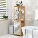 Color: Natural + White Material: Bamboo, Faux Linen Fabric Overall Dimensions: 36 cm x 33 cm x 130 cm (L x W x H) Size of Clothes Basket: 30 cm x 29 cm x 48.5 cm (L x W x H) Distance Between Shelves: 30 cm Weight Capacity of Each Shelf: 10 kg Weight Capacity Clothes Basket: 5 kg Net Weight: 6.5 kg