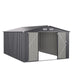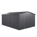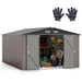 Say goodbye to cluttered outdoor spaces with the garden metal shed! With generous dimensions of 426 cm x 300 cm, the storage shed provides ample space to accommodate a diverse range of items, such as pet stuffs, bicycles, and lawn mowers. Thanks to the sloped roof, water can be quickly drained out through the grooves during rainy days. The garden shed is mainly made of color-coated metal sheets, which are rustproof and waterproof for long-lasting performance. Therefore, the tool storage house is suitable for all season use. Featuring 3 thick beams and reinforced base, the outdoor storage shed boasts a sturdy design. Thoughtfully, a lockable door protects your belongings from theft, while the air vents preventing unpleasant smells buildup. For safe assembly, 2 pairs of gloves are provided to keep your hands clean. Generous Size & Wide Usage: With a 668 cu.ft impressive storage capacity, the 426 cm x 300 cm large outdoor storage shed houses everything from pool equipment and garden tools to bicycles and repair kits. Beyond just storage, the utility tool house can be converted to a cozy retreat for your pets as needed. Weather-proof Pitched Roof: The outdoor storage room features a color-coated metal roof that stands strong against diverse weather conditions. Additionally, the pitched roof minimizes stress on the structure and enhances water drainage, ensuring prolonged use. High-strength Windproof Structure: Boasting heavy-duty structure, the outside tool organizer offers unmatched durability and strength. Internally, the shed is fortified with 3 crossbeams and reinforced base, which provide additional stability against strong winds. Enhanced Security & Ventilation: The garden tool house is equipped with a lockable door that ensures your belongings are well protected. Moreover, 4 air vents are included to facilitate continuous airflow, thus maintaining a fresher environment and extending the life of the items. Extra Gifts & Humanized Details: Each heavy-duty storage house comes with 2 pairs of protective gloves to keep your hands safe during assembly. Also, the corners of the shed's roof are equipped with plastic covers to prevent accidental injuries. All screws feature protective caps to ensure a longer lifespan for the hardware.
