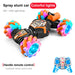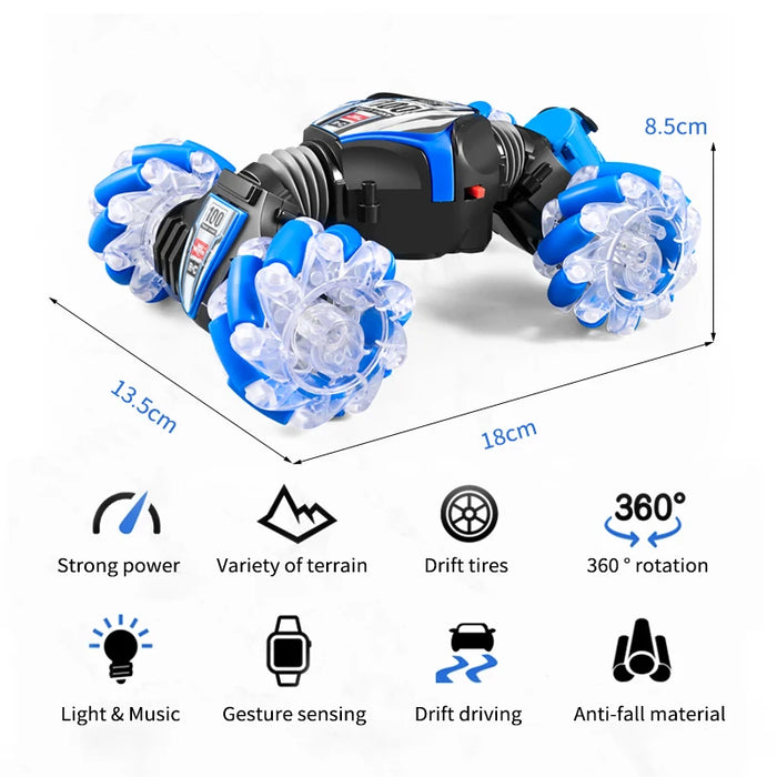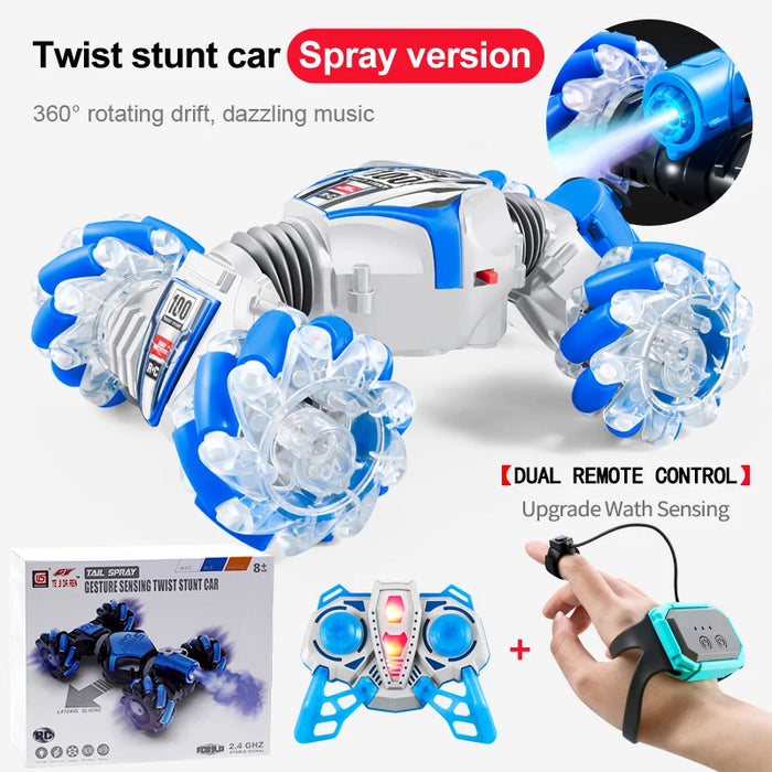This stunning toy car also introduces you to dazzling tricks like 360° rotation and gesture control, coming with two remote control options, handle and hand gesture. The RC stunt car's abilities don't stop there - it also flaunts a spray tail and a dual form feature, letting it flip from flat form to climbing form in no time.