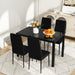 Colour: Black Material: Glass, Metal, PU, Plywood Dining Table Dimensions: 120 x 70 x 75 cm (L x W x H) Dining Chair Dimensions: 52.5 x 43 x 96.5 cm(L x W x H) 4 Pcs Chairs Net Weight: 15 kg Load Capacity: 150 kg Box QTY: 1(May vary by batch) Package Includes: 1 x Dining Table 4 x Dining Chair 1 x Instrcution Manual