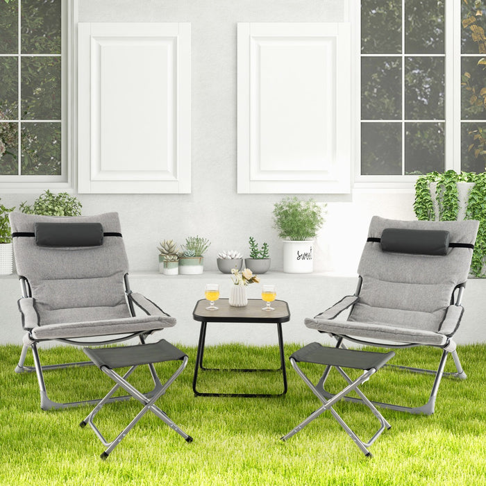 Step out into your personal haven with our 5-piece patio set, offering the pinnacle of outdoor leisure and style. Whether it's the balcony that overlooks the city or a quiet corner in your garden, this ensemble allows you to create a tranquil retreat right at home or even by the seaside. Crafted for comfort and convenience, find serenity with our set that includes two foldable sling chairs, accompanied by plush ottomans, and a chic coffee table to round out the perfect lounge experience.