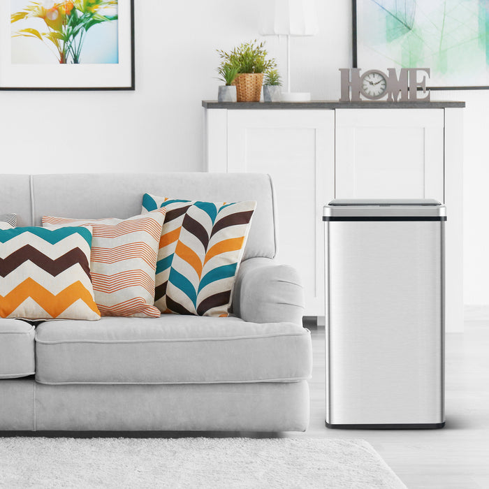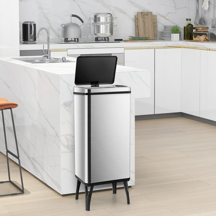 Experience the ultimate touch-free waste disposal with the innovative motion sensor trash can. Simply hover your hands above the lid and watch it open like magic, thanks to the advanced motion sensor technology. With a spacious 50L capacity, this stainless steel beauty can hold a mountain of trash, which can meet daily needs and hide mess and odor. No need to bend over! The detachable legs raise the trash bin to a user-friendly height, leaving enough clearance for floor-cleaning. There are even non-slip foot pads for enhanced stability. Say goodbye to smudges and scratches, as the stainless steel exterior is fingerprint-resistant, anti-scratch, and oil-proof. The lid closes effortlessly after 5 seconds, or simply tap the touch button to keep it open. Activate the sensor function with a press and hold of the button, and experience the future of waste disposal. Motion Sensor Technology: Equipped with advanced motion sensor technology, this trash can opens automatically when you hover your hands above the lid within 15-25cm, providing a touch-free and hygienic waste disposal experience. And if you need a stay-on lid, tap the touch button to keep the lid open. 50L Generous Capacity: With a generous 50L capacity, this stainless steel waste can offers ample space to accommodate all your household waste, reducing the need for frequent emptying. Say goodbye to overflowing trash cans! Detachable Legs: The detachable legs of trash bin offers versatility in placement and convenience in cleaning floor without moving the bin. Plus, the raised height not only benefits garbage-tossing, but also keeps the trash away from paws. Sleek and Durable Stainless Steel Exterior: Crafted from high-quality stainless steel, this garbage can is not only stylish but also built to last. Its sleek surface is anti-fingerprint, anti-scratch and oil-proof, looking pristine with minimal effort. Wide Application: The automatic garbage bin requires 4 x AA batteries (NOT included). With clean lines and sleek surface, it will be a functional and stylish addition wherever you need, like kitchen, living room or office.