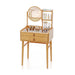 Color: Natural Material: Bamboo + MDF + Tempered Glass + PE Rattan Overall Dimension: 60 cm x 47 cm x 121 cm (L x W x H) Tabletop Height: 75 cm Mirror Dimension: 30 cm x 22 cm Interior Dimension of Shallow Drawer: 52 cm x 28 cm x 4 cm (W x D x H) Interior Dimension of Deep Drawer: 52 cm x 28 cm x 7 cm (L x W x H) Weight Capacity of Tabletop: 50 kg Weight Capacity of Each Drawer: 5 kg Net Weight: 16 kg Box Qty: 1(May vary by batch) Package Includes: 1 x Mini Vanity Table 1 x User Guide