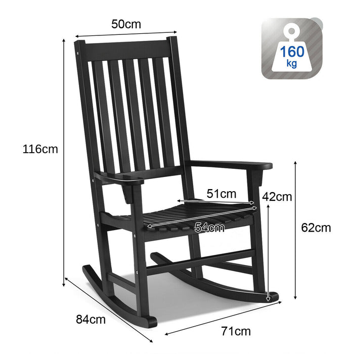 Finished in either a crisp White or elegant Black, the chair's dimensions are as follows: 84 cm in length, 71 cm in width, and 116 cm in height, accommodating a weight of up to 160 kg with ease. The spacious seat measures 53 cm in width and 51 cm in depth, positioned 42 cm above the ground for optimal comfort. The armrest height ensures a relaxing posture at 62 cm from the ground. Each package delivers a single Acacia Wood Rocking Chair accompanied by a user-friendly instruction manual.