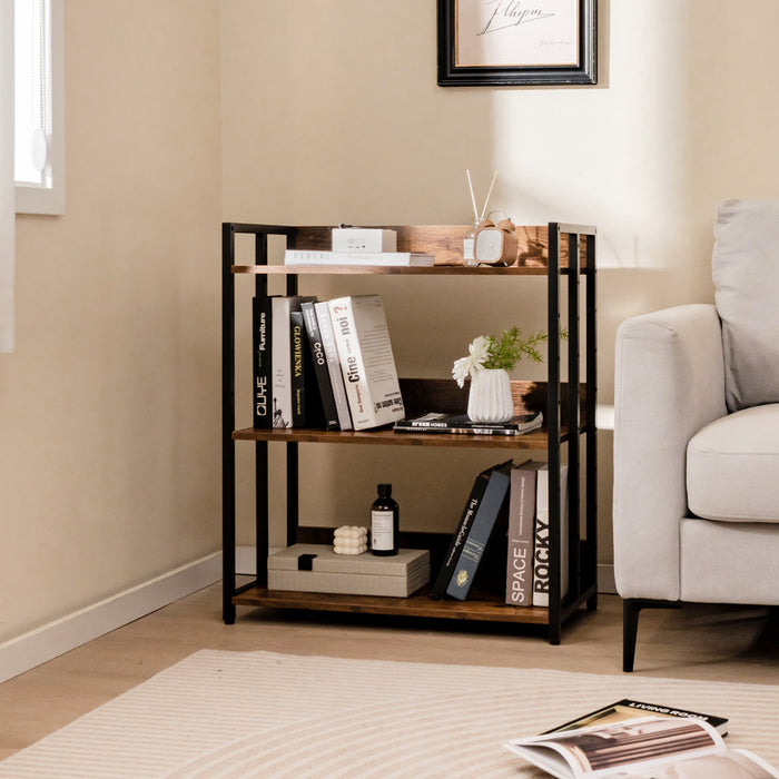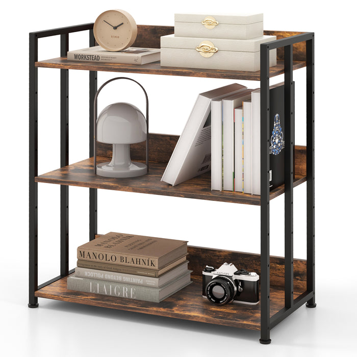 Adjustable 3-Tier Bookshelf - Rustic Brown with Metal Frame - Ideal for Home or Office Storage Solutions