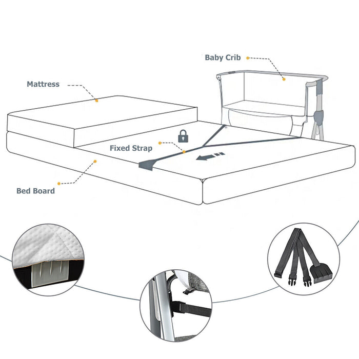 Our crib's design prioritizes your baby's safety with a robust triangle structure, reinforced by premium materials. The legs of the crib are crafted from high-grade aluminum, ensuring a solid foundation and exceptional stability. With the added feature of a fastening belt, the crib can be securely attached to your bed, giving you peace of mind that your child is safe and sound.
