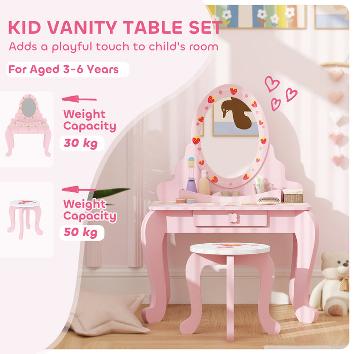Transform your little children's room into a magical space with the AIYAPLAY kids vanity table set. Featuring a charming strawberry print and a safe, shatter-resistant acrylic mirror, this set includes a perfectly matched stool. It boasts a built-in drawer with bow-style knobs for a tidy space.