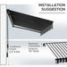 Set up is a breeze with no assembly required, and the awning comes with all the necessary mounting hardware for installation. Ideal for mounting against concrete, solid brick, or even hardwood surfaces, it's designed to fit effortlessly into your space. Simply ensure a recommended height of 2.5-3.5m and a clearance of 10-15cm above doors and windows for perfect placement.