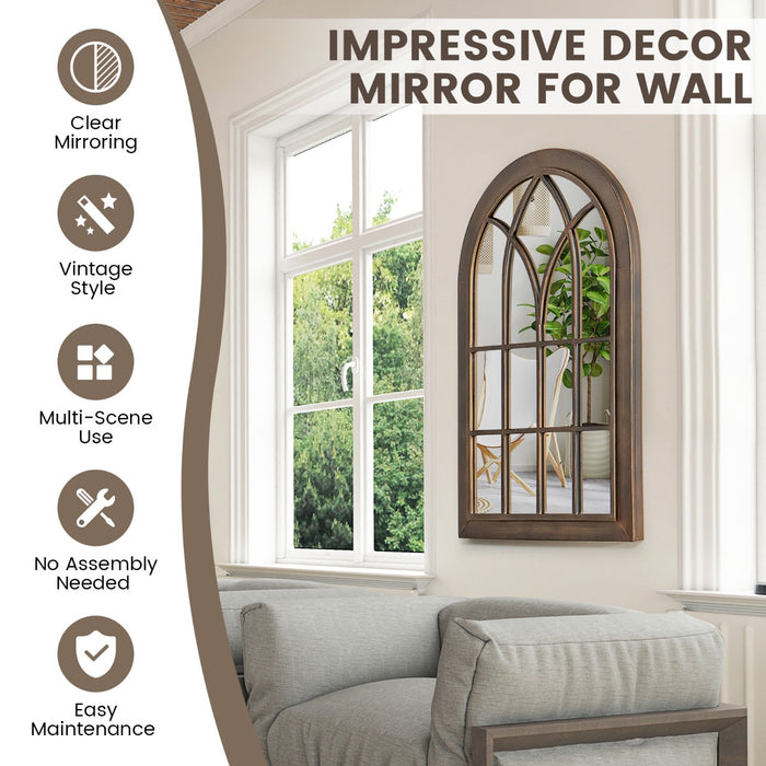 Introducing our beautifully designed arched wall mirror, the perfect addition to enhance any room's aesthetic. Its elegant silhouette and rustic brown hue present a blend of classic charm and modern flair. Crafted with precision, this mirror provides functionality while acting as a stunning decorative piece.