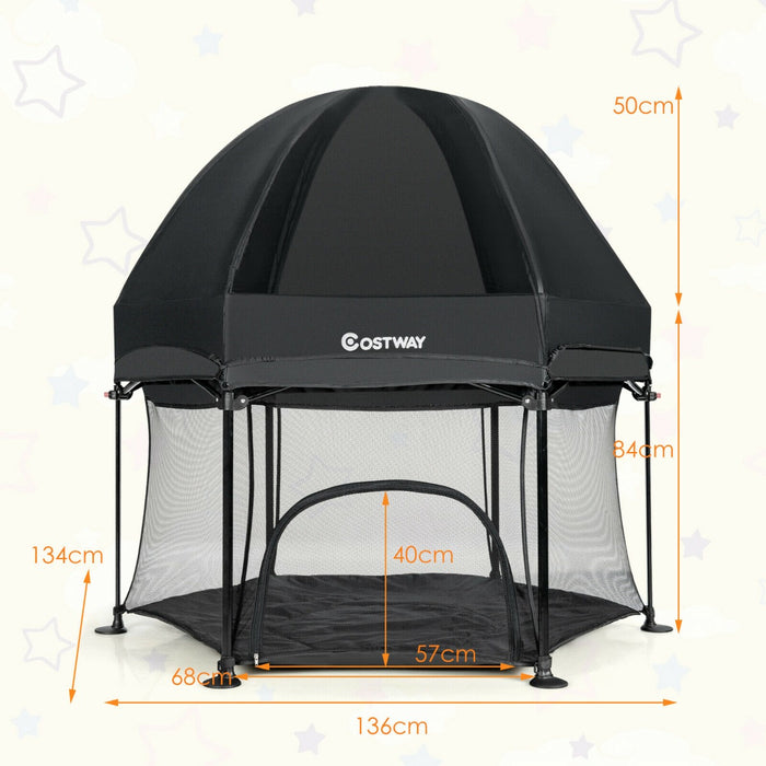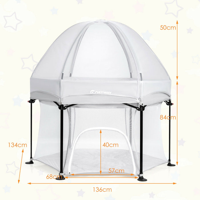 Playpen: 136 x 134 x 84 cm (LxWxH); Canopy Height: 50 cm; Zipper Door: 57 x 40 cm (LxW); Carrying Bag: 83 x 30 cm (LxW) |
