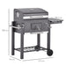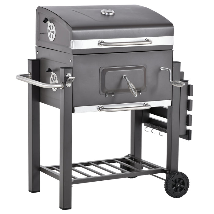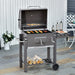 Transporting your BBQ station is hassle-free thanks to its robust wheels. Simply wheel the grill to your desired location to start the party. Dimensions underscore its substantial presence and utility: Overall - 115L x 56W x 108H cm; Side Table - 33.5L x 48.5W cm.